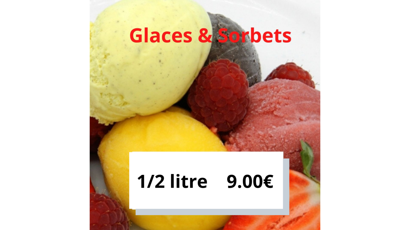Sorbets abricot, pomme verte, framboise et fraise des bois avec meringue. 5.50€/pers